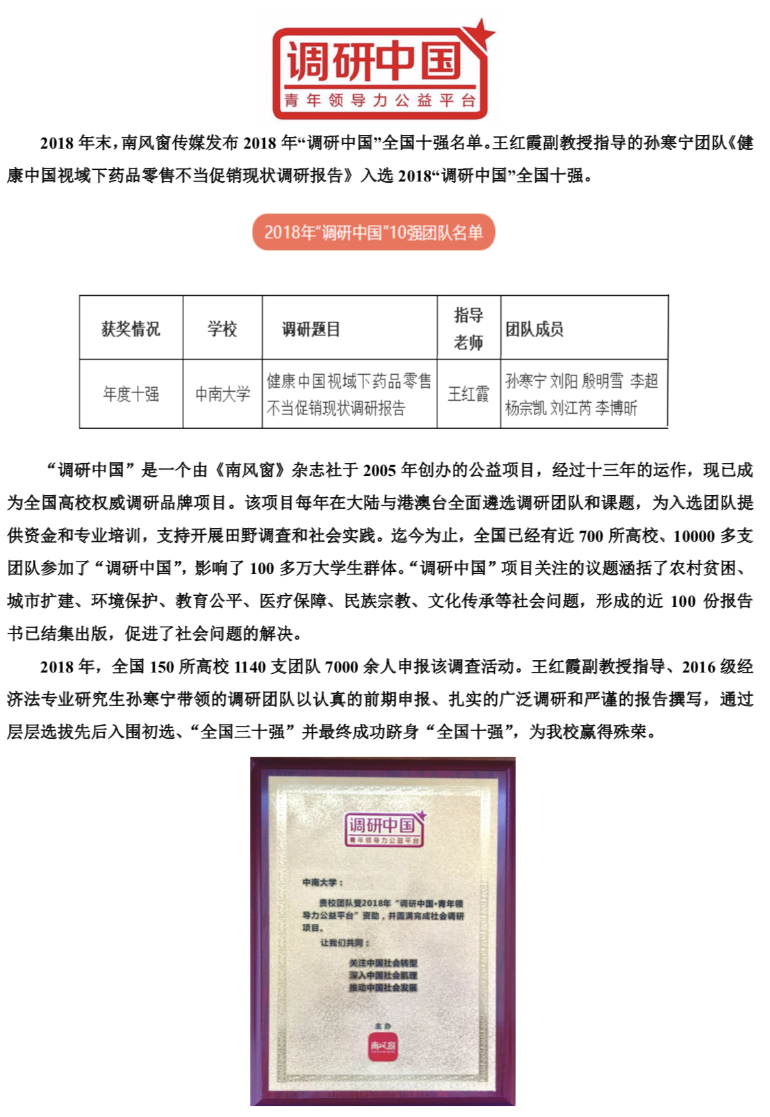 王红霞副教授指导的孙寒宁调研团队入选“调研中国”全国十强。