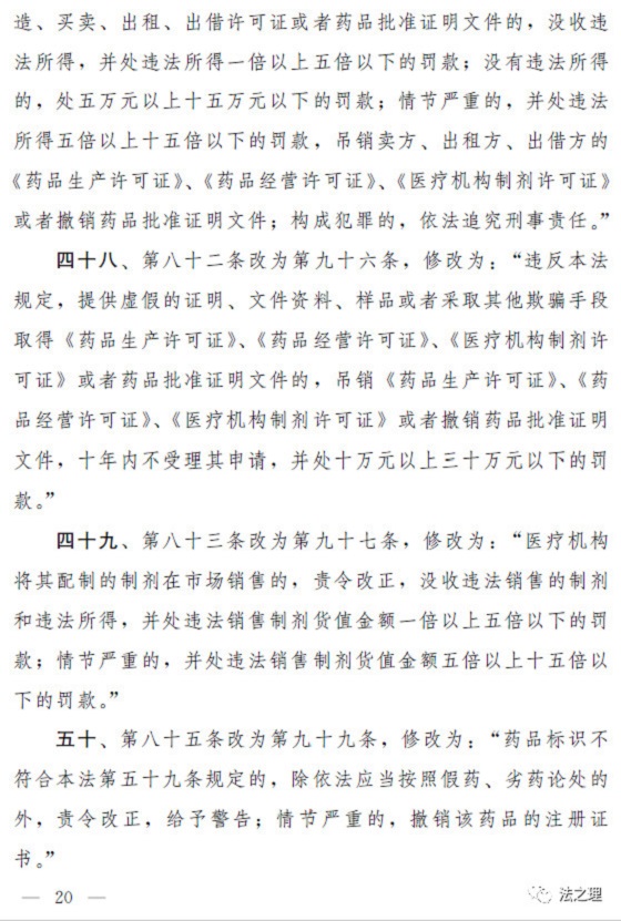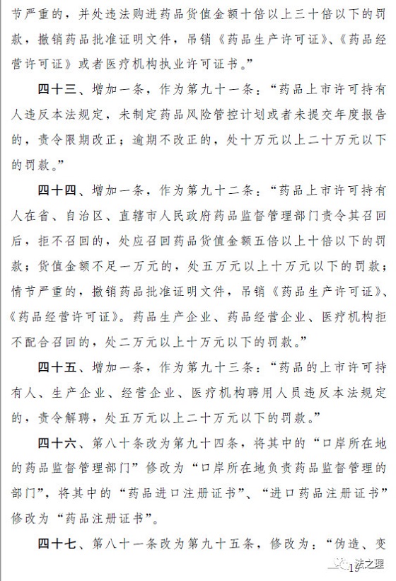 (三)加大对违法行为的处罚力度,解决违法成本低、处罚力度弱的问题。一是全面加大对违法行为的行政处罚力度。提高对违法行为罚款的下限或者上限,例如,规定对未经许可生产经营药品的,罚款的幅度从货值金额的二倍至五倍提高到五倍至三十倍;对生产销售假药等违法行为增设停产停业等处罚;明确对生产销售属于假药、劣药的疫苗等6类违法行为,在法定幅度内从重处罚。(第三十六条至第三十八条、第四十条至第四十二条、第四十七条至第四十九条、第五十一条)二是落实“处罚到人”要求,对严重违法行为的责任人进行处罚。有生产销售假劣药、违反质量管理规范等行为的,对单位的法定代表人或者主要负责人、直接负责的主管人员和其他直接责任人员处以没收收入、罚款、十年直至终身禁业的处罚。(第三十九条、第四十一条、第五十三条)三是结合本次修法相应补充了药品上市许可持有人的法律责任以及违反报告、召回等新设义务的法律责任。(第四十一条至第四十四条、第五十三条)四是细化并加重对地方政府负责人和监管人员的处分,对隐瞒、谎报、缓报药品安全事故等行为规定了严格的处分。(第五十六条、第五十七条)