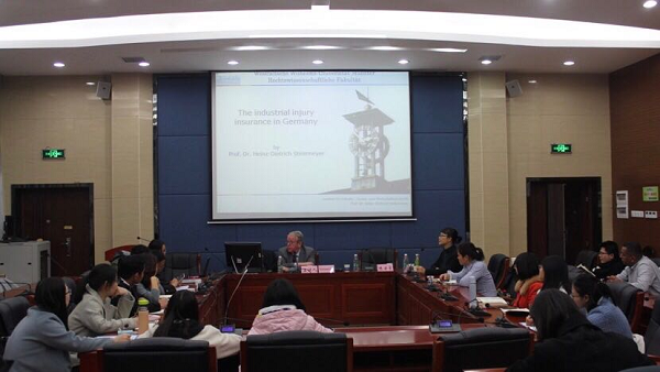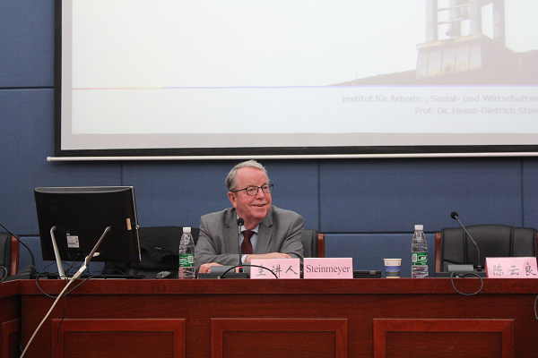 邵华副教授对施坦因迈耶教授的到来表示感谢,并对其作了简短介绍。施坦因迈耶教授从事法律教育研究三十余年,长期从事劳动法、社会保障法的教学与研究,颇有心得,著述丰富,先后发表著作论文上百篇,是德国著名劳动法与社会保障法学家,德国明斯特大学球王会教授。其曾先后担任德国哈根大学、明斯特大学等球王会经理、明斯特大学球王会劳动法、社会保障法和经济法研究所所长等职务,并多次受邀作为专家组成员参加欧盟和德国劳动法和社会保障领域的立法及相关工作。现任欧洲网络补充养老金研究学会主席。教授还长期关注中国社会保障法的发展和实施,曾由德国政府委派作为德方专家参与中德社会保障法法律研讨活动。