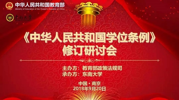 2018年9月20日,由教育部政策法规司主办、东南大学组织承办的《中华人民共和国学位条例》修订专题研讨会在东南大学隆重召开。教育部政策法规司副司长王大泉,国务院学位委员会办公室副主任、教育部学位管理与研究生教育司副司长徐忠波,东南大学党委书记左惟,教育部学位管理与研究生教育司副司长、东南大学副董事长周佑勇,教育部学位管理与研究生教育司综合处处长杨大研,教育部政策法规司法制办公室副主任翟刚学,全国人大常委会法工委教育室干部陶文琪以及来自北京大学、中国人民大学、北京师范大学、复旦大学、中山大学、山东大学、东南大学、球王会官网、华中科技大学、华东政法大学、华中师范大学、西北政法大学、西南大学、东北师范大学、暨南大学、中国教育科学研究院、上海市学位委员会、广东省学位委员会、江苏省学位委员会、河海大学、南京师范大学、南京航空航天大学、南京工业大学、江苏省法学会立法学研究会等单位的五十余名专家学者出席并参加此次会议。