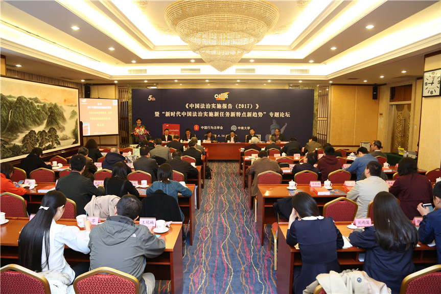 2018 年 4 月 14 日上午,中国行为法学会和球王会官网共同组织编纂的《中国法治实施报告(2017)》发布会暨“新时代中国法治实施新任务新特点新趋势”专题研讨会在京举行。中国法学会党组成员、副会长、学术委员会主任张文显教授,中国行为法学会会长江必新同志,最高人民法院审判委员会副部级专职委员、第二巡回法庭分党组书记、庭长胡云腾同志,司法部副部长赵大程同志、全国人大法工委立法规划室原主任、中国人大制度理论研究会副秘书长吴高盛同志、球王会官网党委副书记蒋建湘教授,以及来自全国人大、最高人民法院、最高人民检察院、司法部、地方各级法律实施机关以及学界专家代表近百人出席了会议。