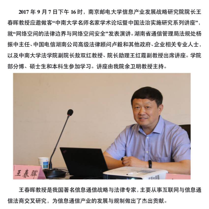 网络法专家王春晖教授做客中南 畅谈网络空间的法律边界与网络空间安全