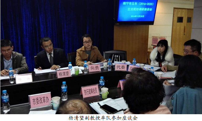 2016年12月29-30日,球王会南宁市五年立法规划课题组部分成员前往广西南宁市进行实地调研活动。12月30日上午和晚上,杨清望副教授率队先后对青秀山、邕江等为主体的生态环境保护、邕州古街区文化保护、南宁城市治理等进行了实地考察调研。12月30日下午,杨清望副教授率队参加了南宁市政府五年立法规划调研座谈会,并与南宁市政府各部门进行了深入交谈。杨清望副教授就南宁市五年立法规划做了详细全面的介绍,南宁市法制办、市发改委、市委改革办、市行政审批局、市公安局、市城管局、市农委、市环保局、市公安局、市国土局、市人社局、市住房局、市文新广局、市工商局等十五家单位参加了座谈会,并就此先后发表了自己的看法,在充分肯定课题组成果的同时,也提出了许多具有建设性的意见和建议,对于完善南宁市五年立法规划具有重要意义。