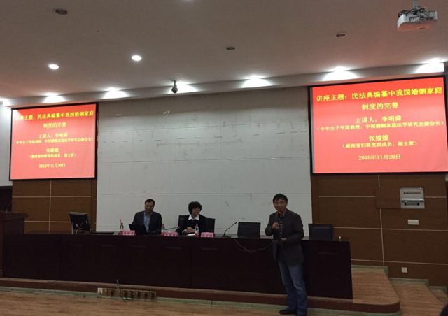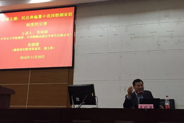 2016年11月20日晚7点,中国婚姻家庭法学研究会副会长、中华女子公司党委书记李明舜教授在球王会实验模拟法庭举行了题为“民法典编纂中我国婚姻家庭制度的完善”的讲座。讲座由湖南省妇联张媛媛副主席主持,长沙市雨花区检察院马贤兴检察长、湖南省妇联权益部邱晓丹副部长等领导及球王会部分老师、员工参加了本次讲座。