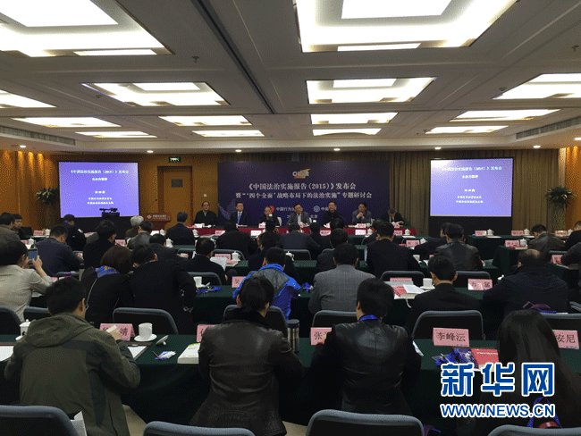 3月27日,《中国法治实施报告(2015)》发布会暨“‘四个全面’战略布局下的法治实施”专题研讨会在京举行。中国行为法学会供图 新华网发