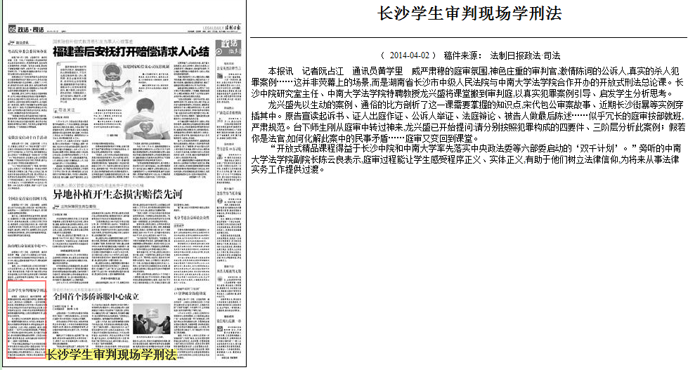 龙兴盛先以生动的案例、通俗的比方剖析了这一课需要掌握的知识点,宋代包公审案故事、近期长沙街暴等实例穿插其中。原告宣读起诉书、证人出庭作证、公诉人举证、法庭辩论、被告人做最后陈述……似乎冗长的庭审按部就班,严肃规范。台下师生刚从庭审中转过神来,龙兴盛已开始提问:请分别按照犯罪构成的四要件、三阶层分析此案例;假若你是法官,如何化解此案中的民事矛盾……庭审又变回到课堂。