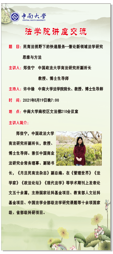 【讲座预告】郑佳宁:民商法视野下的快递服务--兼论新领域法学研究思维与方法