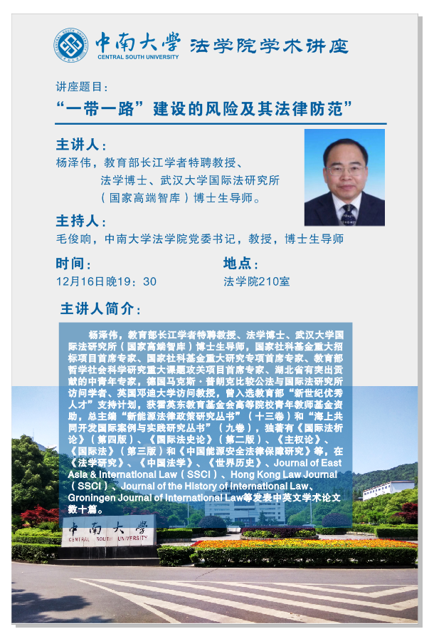 【讲座预告】杨泽伟:“一带一路”建设的风险及其法律防范