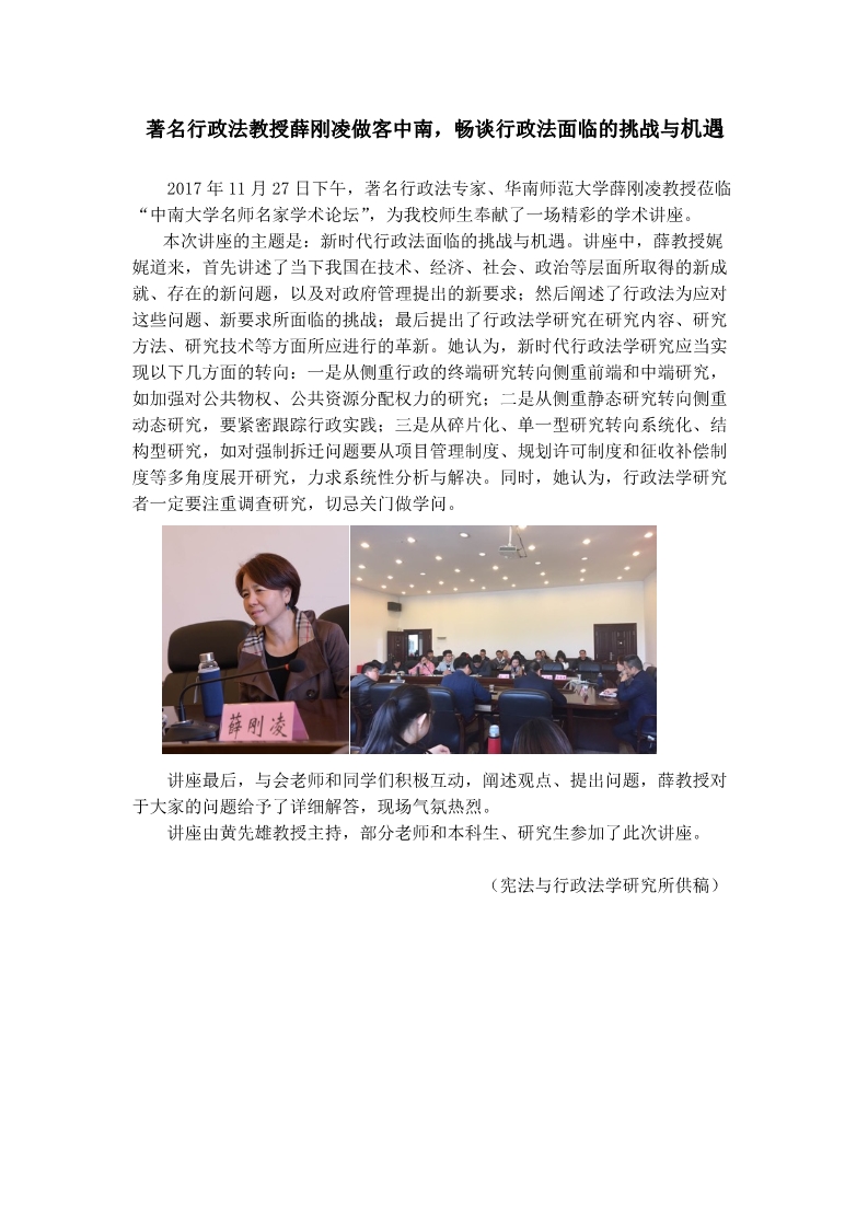著名行政法教授薛刚凌做客中南,畅谈行政法面临的挑战与机遇