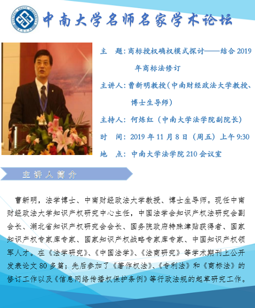 主讲人简介:曹新明,法学博士,中南财经政法大学教授、博士生导师。现任中南财经政法大学知识产权研究中心主任,中国法学会知识产权法研究会副会长、湖北省知识产权研究会会长、国务院政府特殊津贴获得者、国家知识产权专家库专家、国家知识产权战略专家库专家、中国知识产权领军人才。在《法学研究》、《中国法学》、《法商研究》、学术期刊上公开发表论文80多篇;先后参加了《著作权法》、《专利法》和《商标法》的修订工作以及《信息网络传播权保护条例》等行政法规的起草研究工作。
