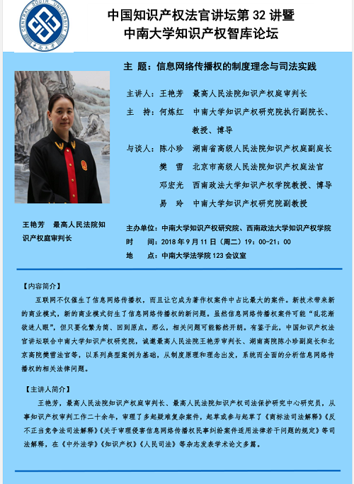 【讲座预告】最高人民法院知识产权庭王艳芳审判长:信息网络传播权的制度理念与司法实践
