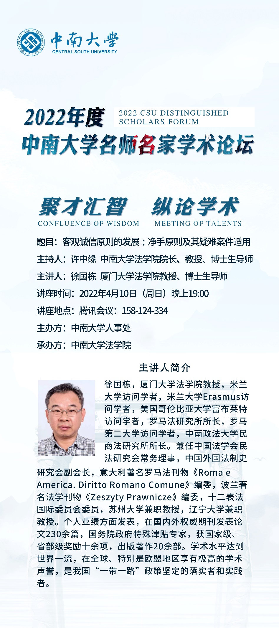 【名师名家讲座预告】徐国栋:客观诚信原则的发展,净手原则及其疑难案件适用