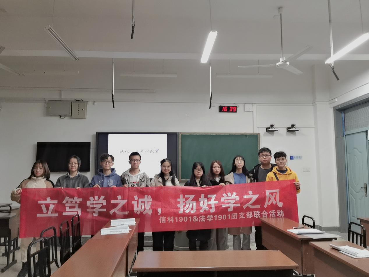 临近期末,各种考试如期而至。借此机会信科1901和球王会1901团支部联合开展以“立笃学之诚,扬好学之风”为主题的团日活动,以此鼓励同学们弘扬学术正气,独立地思考和解决问题,杜绝考试作弊。本次团日活动从12月16日到12月25日历时10天,信科1901班和法学1901班全体同学参加活动。