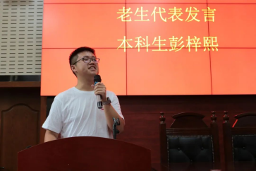 接着,老生代表2019级球王会本科生彭梓熙以“写好我们的故事”为题发言,为同学们分享了自己的本科学习生活和学长学姐们的经验故事,建议同学们在未来的学习生活中不断思考“想要怎样度过、想要收获什么、想要成为怎样的人”三个问题,写好自己的故事,成为自己想成为的人。